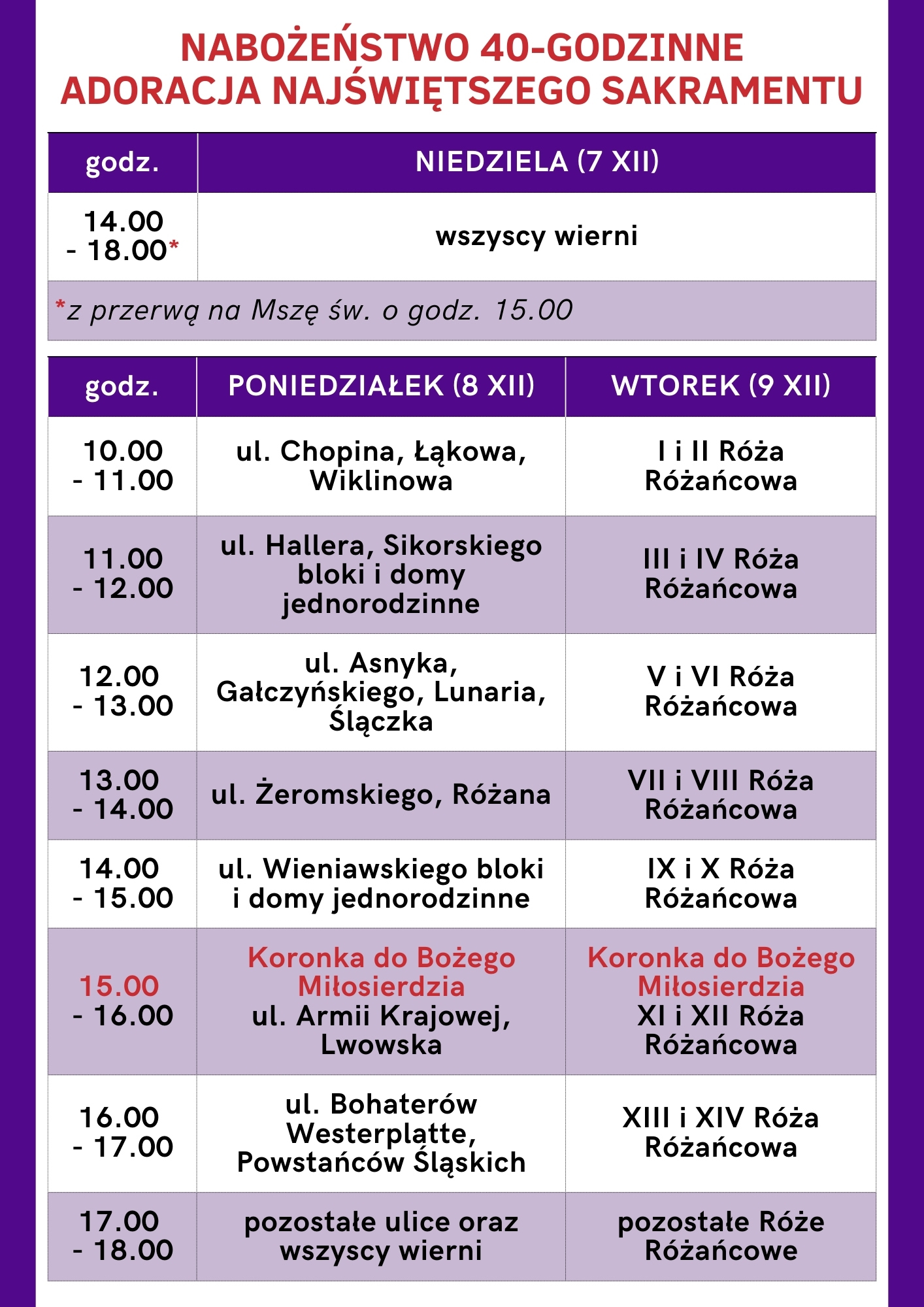 Wieczorną Mszą św. w sobotę (6.12.) rozpoczynamy nabożeństwo 40-godzinne, które jest jednym ze sposobów na dobre przeżycie Adwentu. Potrwa ono do wtorku 9.12. Zachęcamy wszystkich parafian do udziału. Poniżej plan nabożeństwa oraz grafik adoracji Najświętszego Sakramentu.