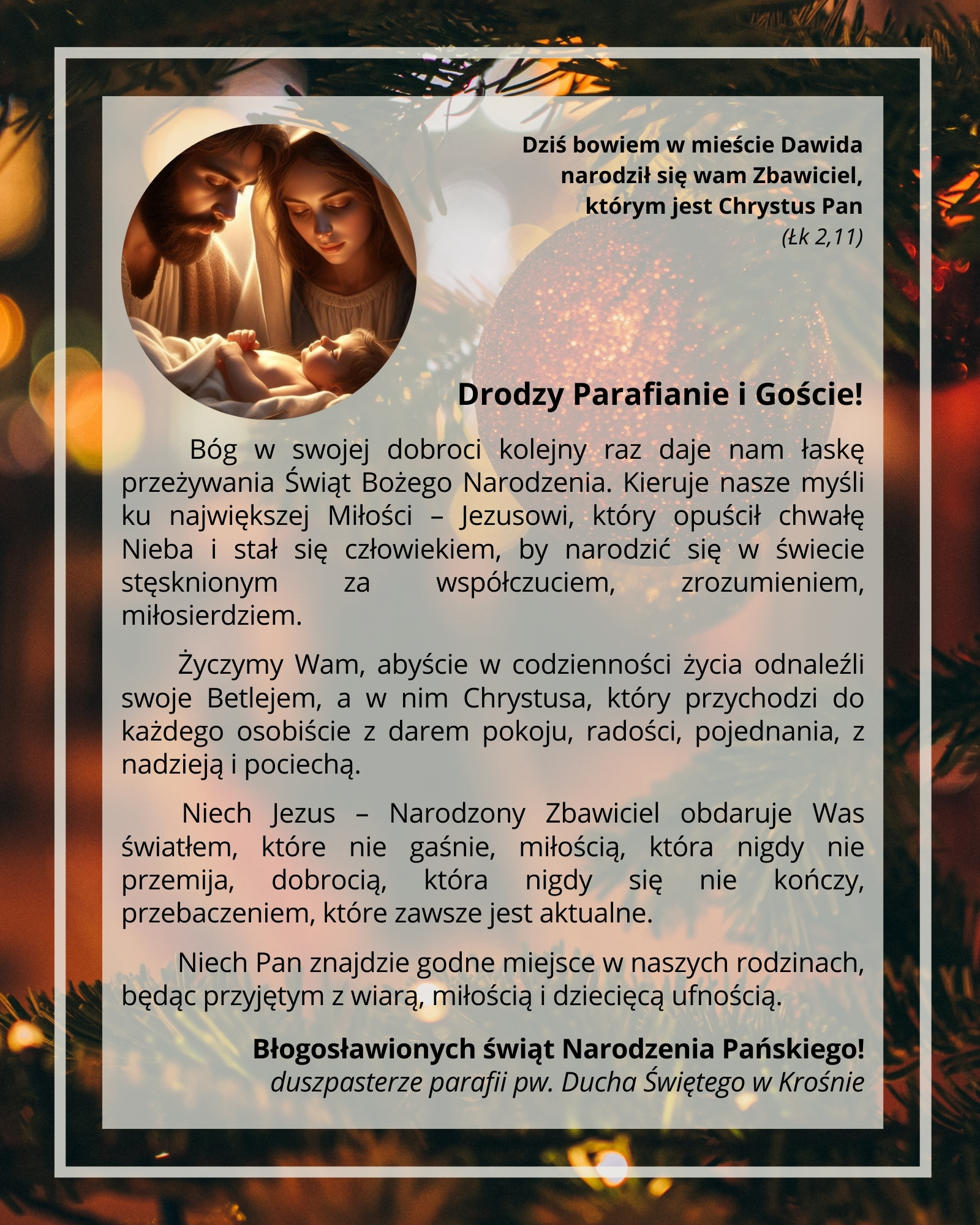Życzenia świąteczne od duszpasterzy 24-12-2025 Błogosławionych Świąt Bożego Narodzenia! Wszystkim Parafianom i Gościom składamy najserdeczniejsze życzenia świąteczne